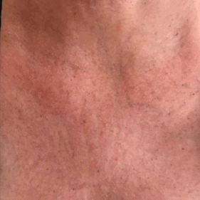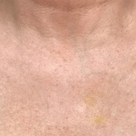 I use a hyaluronic acid based product that targets three factors considered to be the most important in skin quality – hydration, smoothness and elasticity. After three treatments or more, skin looks taunter and the sun damage is lessened. If your décolletage or neck is showing signs of crepiness and needs plumping and hydrating you will benefit from this treatment.